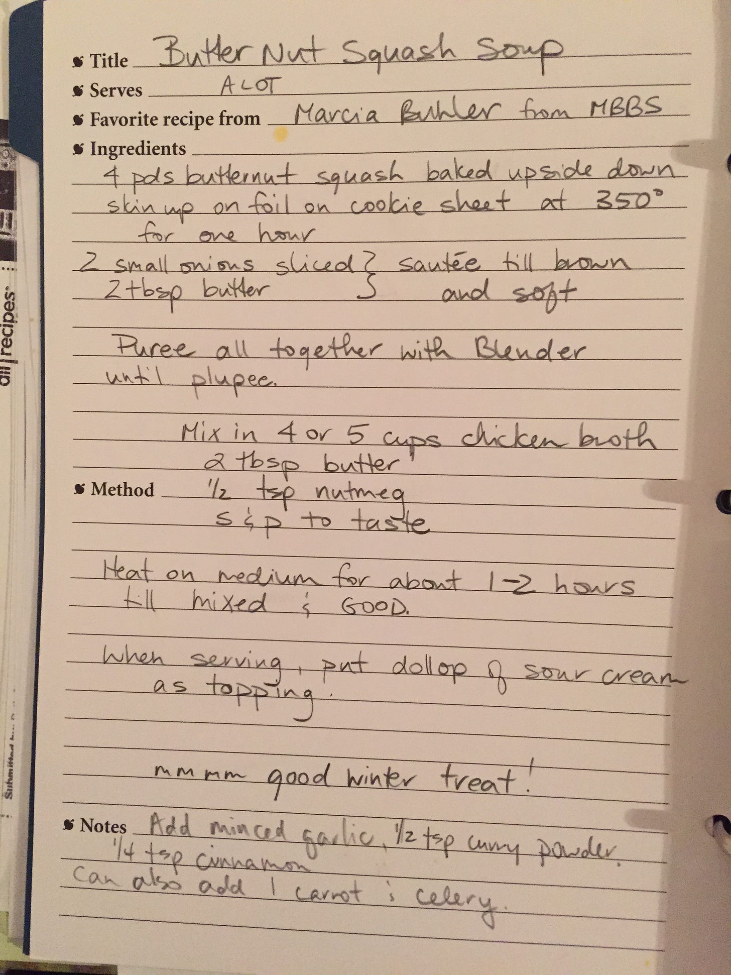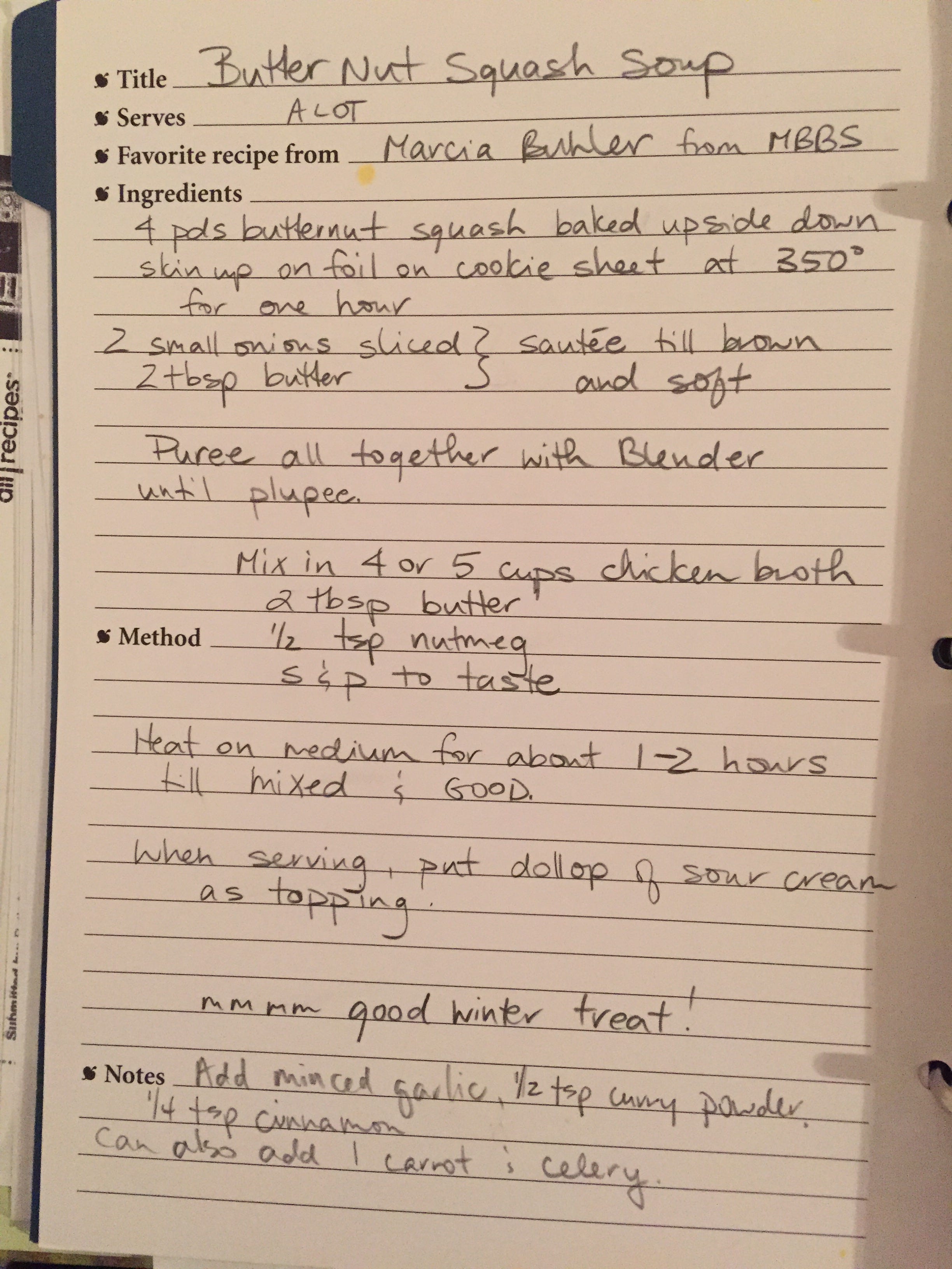 I got this recipe from one of my student leadership mentors during my undergrad, and I have enjoyed this butternut squash soup every fall/winter for years now. It is the best, and I am sincerely indebted to Marcia Buhler, whoever she is, for this recipe.